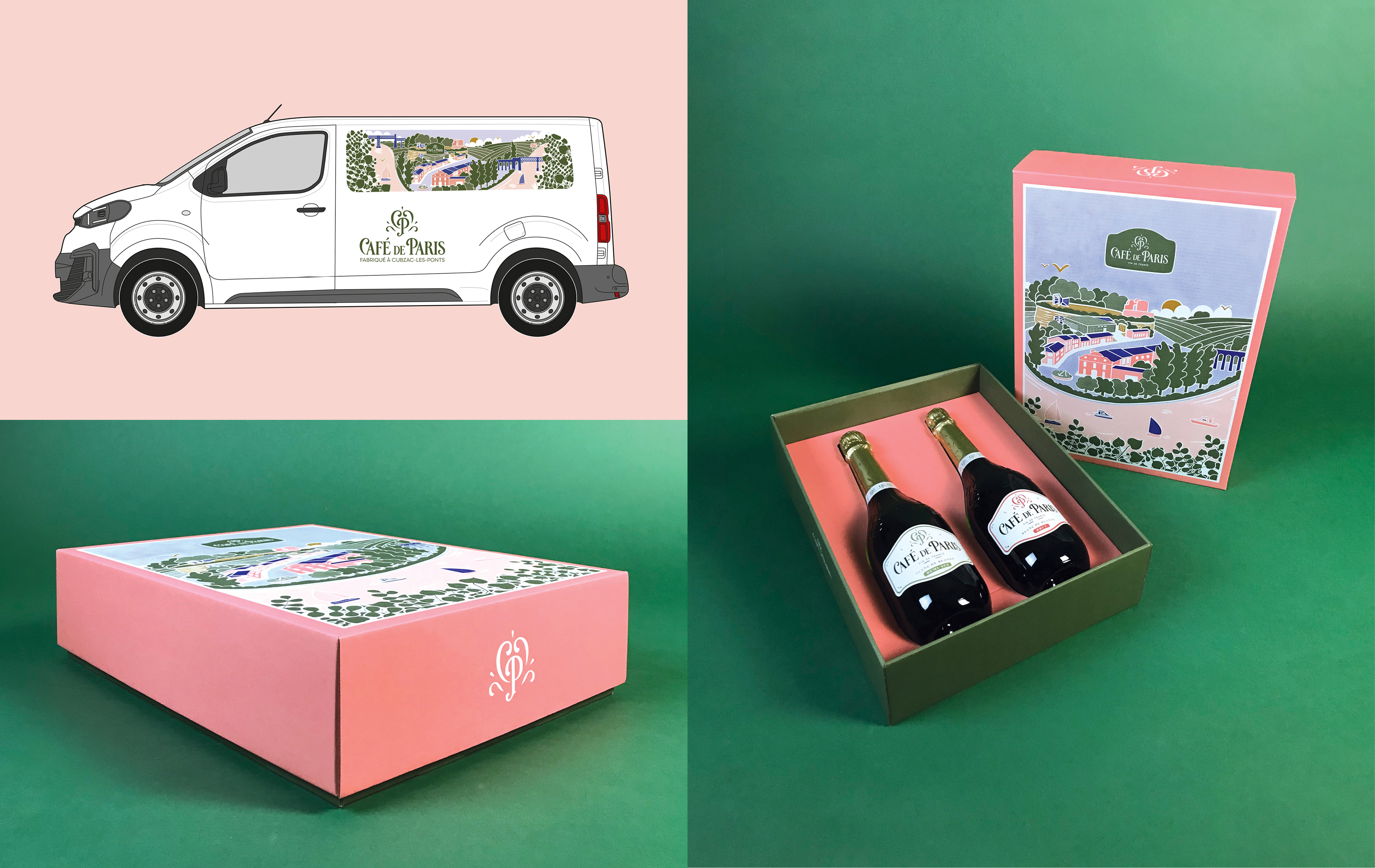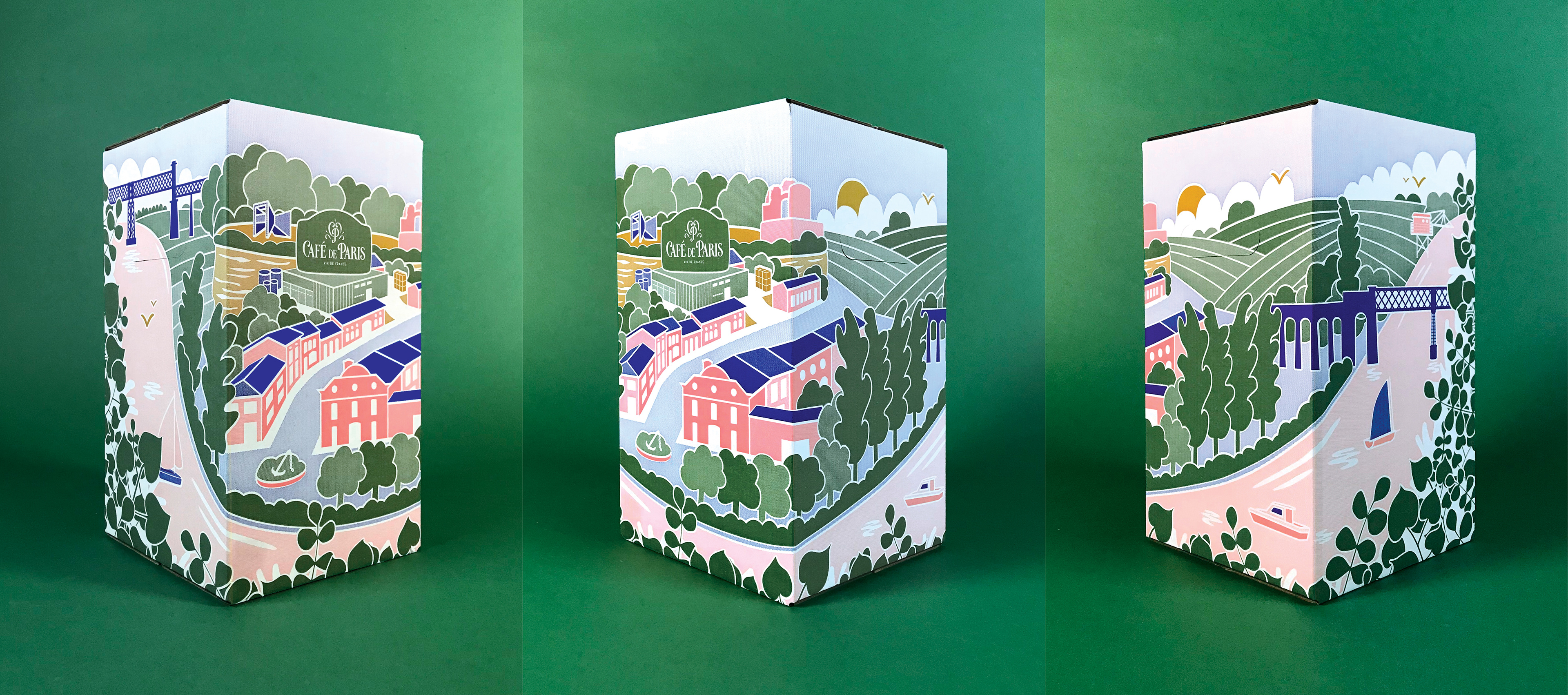 La marque de vins effervescents Café de Paris souhaitait créer un visuel coloré et chaleureux représentant son implantation à Cubzac-les-Ponts, au cœur d’un environnement naturel, patrimonial et architectural.